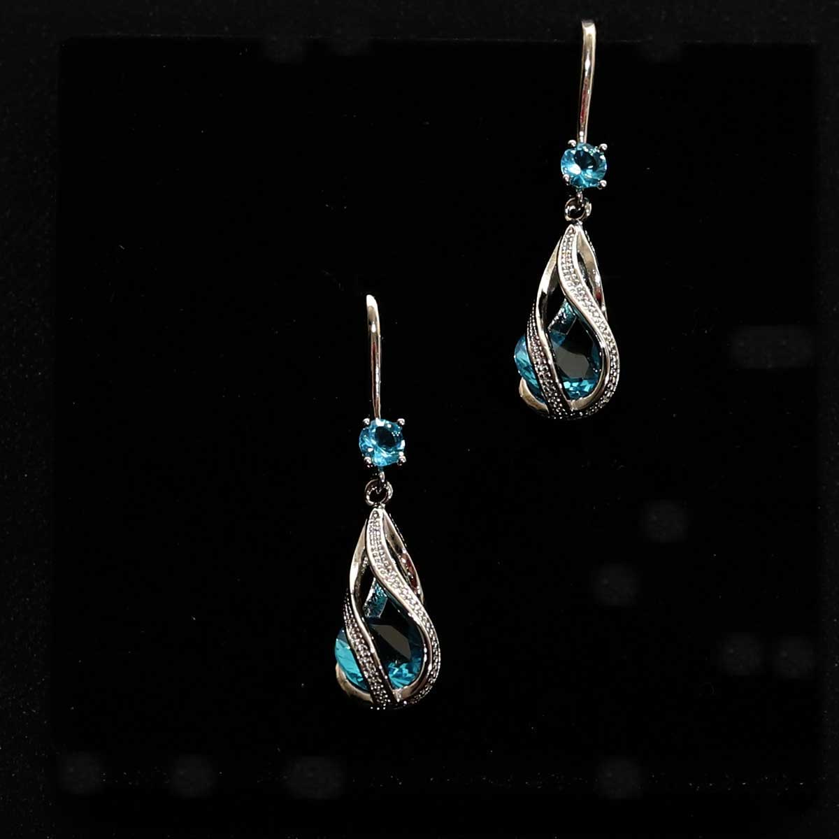 Náušnice majú moderný tvar kvapky, ktorú objíma špirálovitá línia vykladaná drobnými kamienkami. V centre sa vyníma väčší modrý zirkón, doplnený menším zirkónom pri afrohačiku. Tento šperk krásne zvýrazní ženskosť a jemnosť každého outfitu.