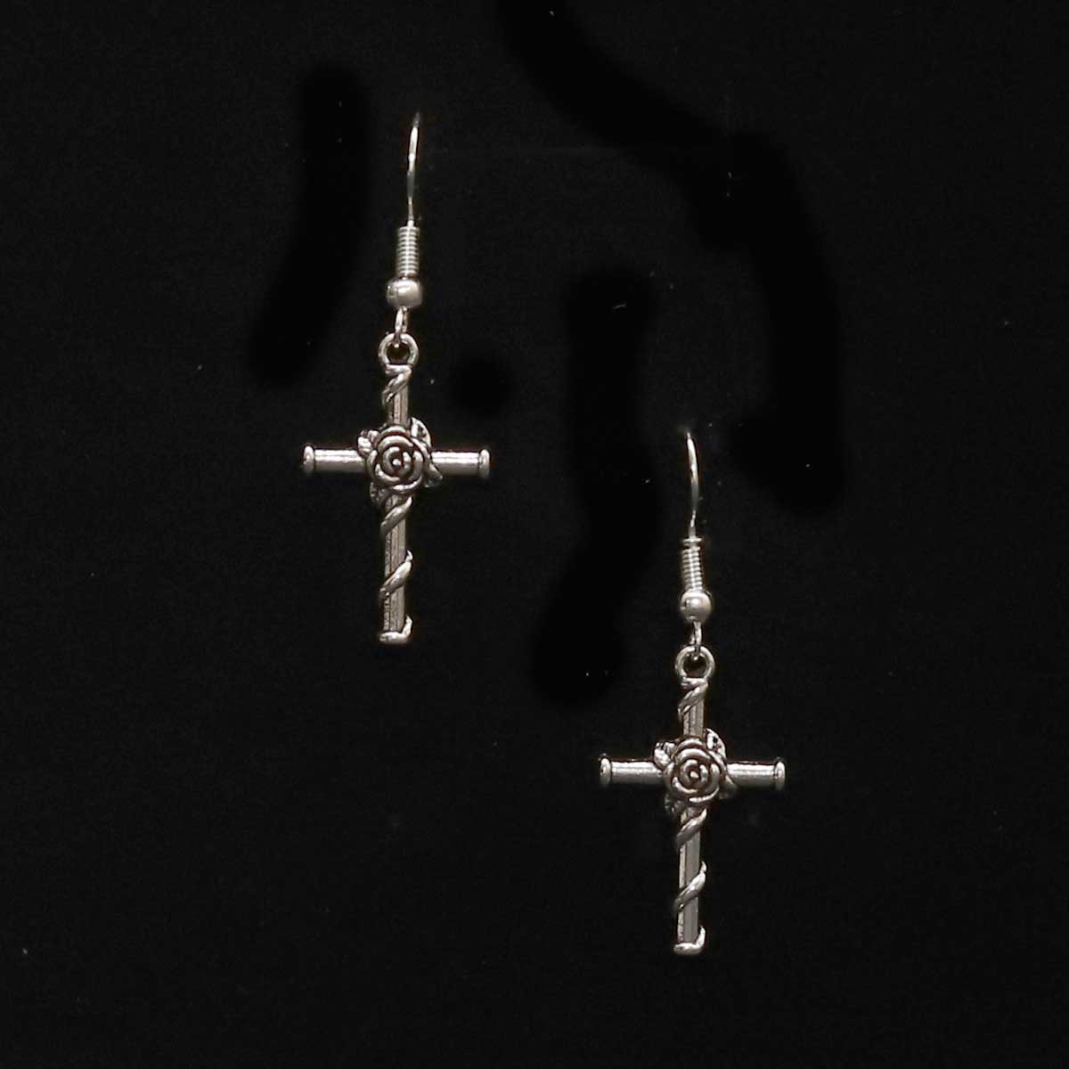 Jedinečný pár visiacich náušníc v retro štýle s krížikom, ktorý je ozdobený detailom ruže. Kombinácia minimalizmu a symbolického kvetinového motívu vytvára odvážny módny doplnok, ktorý oživí každý outfit. Ideálne pre milovníkov alternatívneho štýlu a gotickej estetiky.